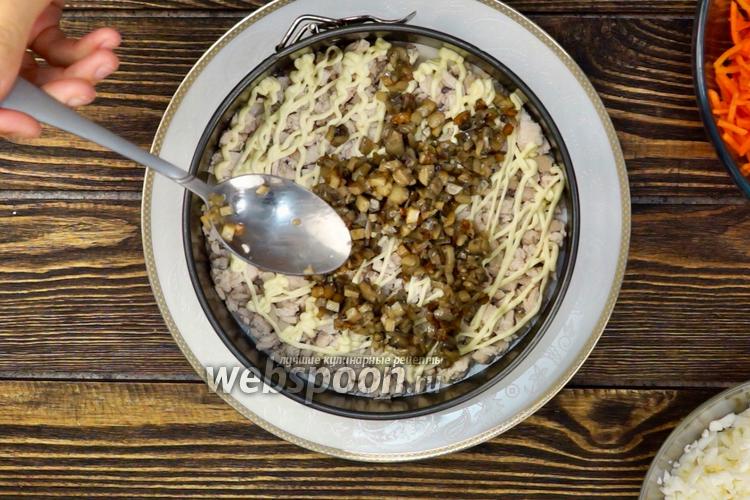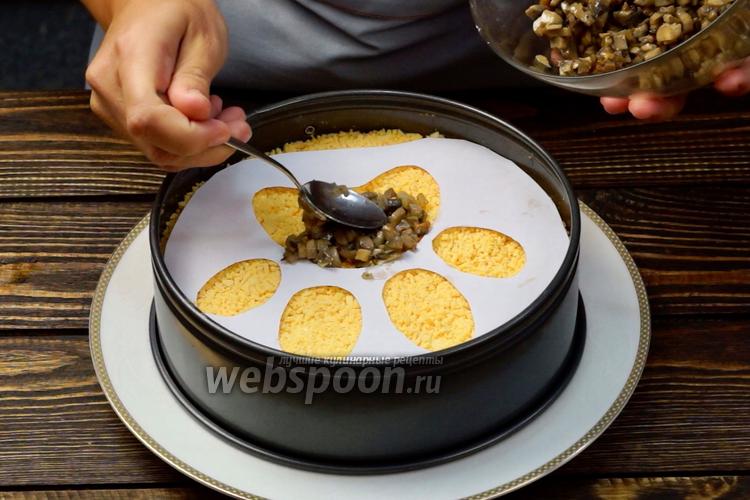 2 слой — обжаренные грибы. Нам надо выложить 2/3 грибов, а 1/3 оставить для украшения.