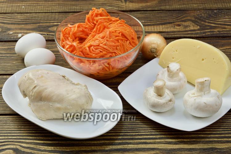 Для праздничного салата Лапа собачки нам понадобятся шампиньоны, лук, морковь по-корейски, твёрдый сыр, отваренные яйца и куриное филе, и майонез.