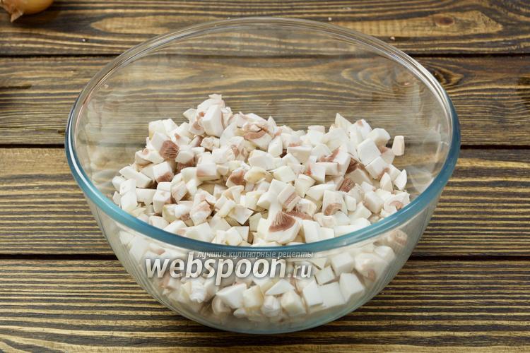 Для начала 400 г шампиньонов нужно помыть, при необходимости почистить и затем порезать мелким кубиком.