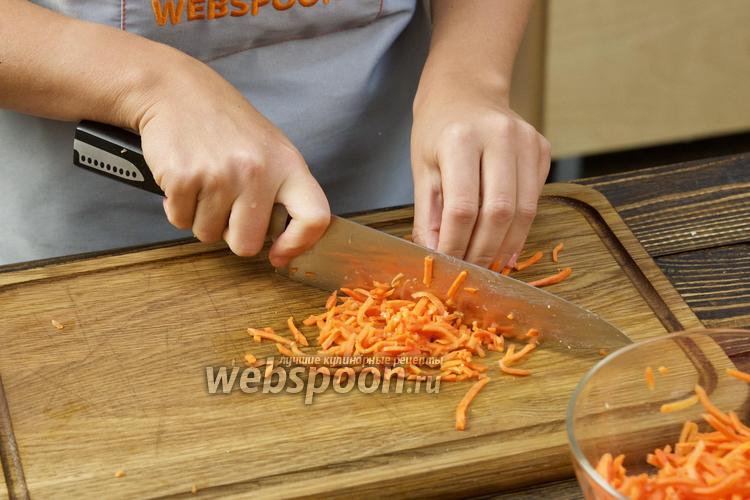 Морковь по-корейски 150-200 г порезать на более мелкие полоски.