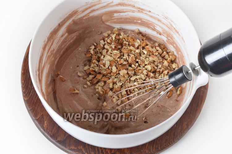 4 белка взбить с сахаром (100 грамм) до образования пышной, стойкой пены. Аккуратно, вручную вмешать просеянную муку (75 грамм) и какао (25 грамм). В конце вмешать нарезанные средними кусочками орехи 75 граммов.