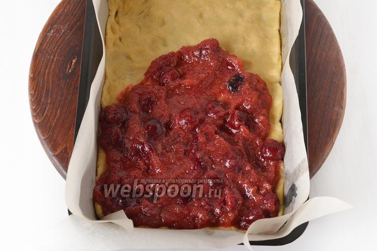 Форму (27х17 сантиметров) с высокими бортиками застелить пергаментом и смазать его подсолнечным маслом (1 ст. л.). Раскатать 1 кусок теста и выложить на дно формы. Сверху выложить вишнёвую начинку.