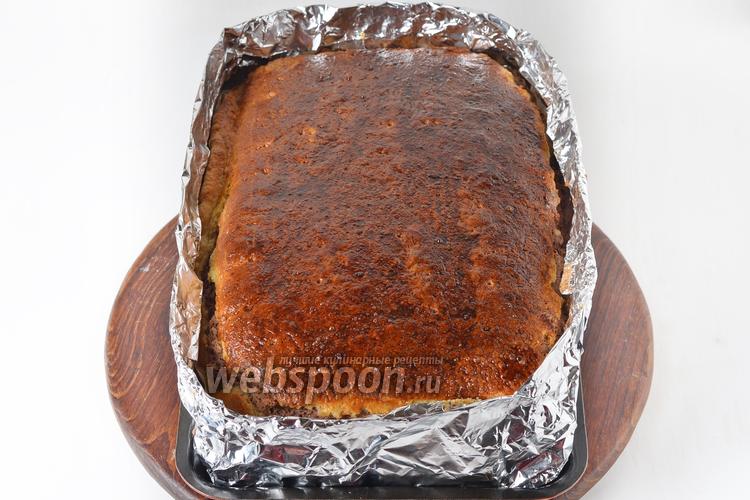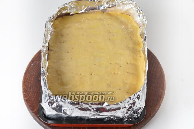 Накрыть четвёртым пластом теста. Поколоть вилкой и оставить в тёплом месте на 45 минут. Затем смазать сверху 1 разболтанным яйцом. Если возникла такая необходимость, то бортики формы можно дополнительно нарастить сложенной в 3 слоя пищевой фольгой.