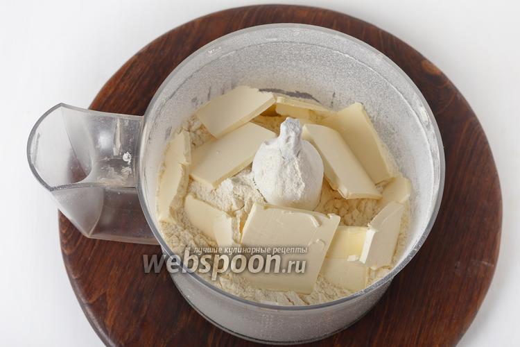 В чашу кухонного комбайна (насадка металлический нож) просеять 400 граммов муки. Сверху выложить нарезанное кусочками холодное сливочное масло 125 грамм. Включить комбайн на 30-40 секунд, чтобы образовалась мелкая крошка.