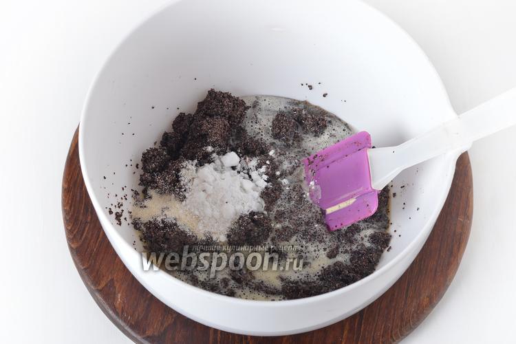 120 граммов мака промыть, залить водой и проварить 5 минут. Отцедить и трижды пропустить через мясорубку. 2 яйца взбить с сахаром (100 грамм) до образования светлой массы. Соединить мак, взбитые яйца с сахаром, апельсиновую цедру (1 ст. л.), 15 грамм крахмала, 50 грамм манной крупы. Перемешать.