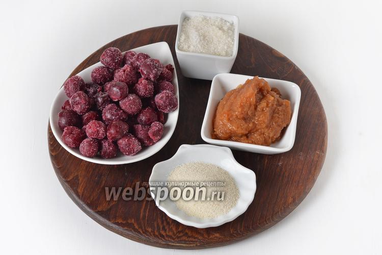 Для приготовления вишнёвой начинки нам понадобится замороженная вишня без косточек, яблочное повидло, сахар, манная крупа.