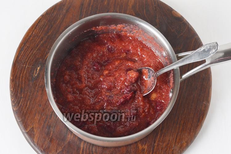 350 грамм вишни соединить с сахаром (100 грамм) и проварить 2-3 минуты. Добавить повидло (150 грамм), растёртое с манной крупой (2 ст. л.). Проварить ещё 2 минуты. Остудить. Масса должна быть густой.