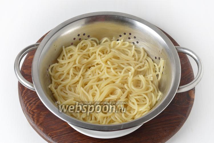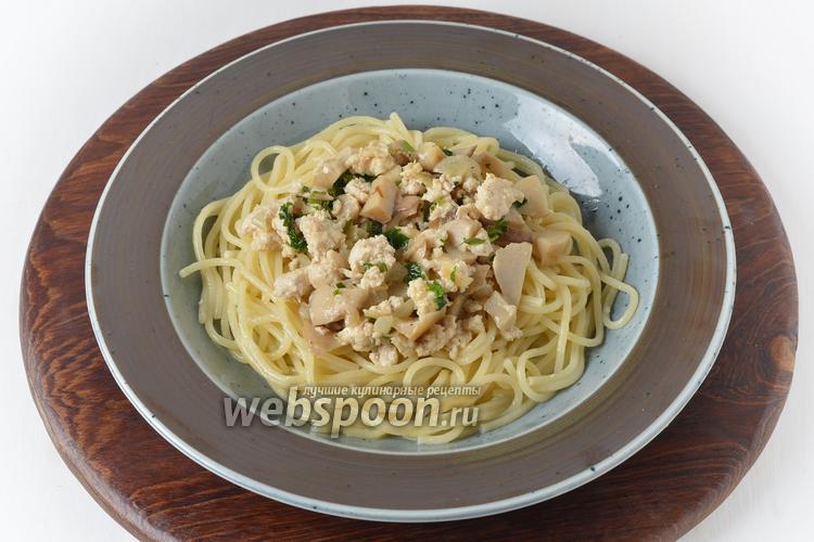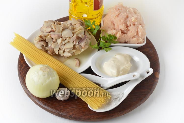 Для работы нам понадобятся спагетти, белые замороженные грибы (они перед заморозкой были отварены до готовности), куриный фарш, репчатый лук, чеснок, сметана, вода, подсолнечное масло, соль, чёрный молотый перец.