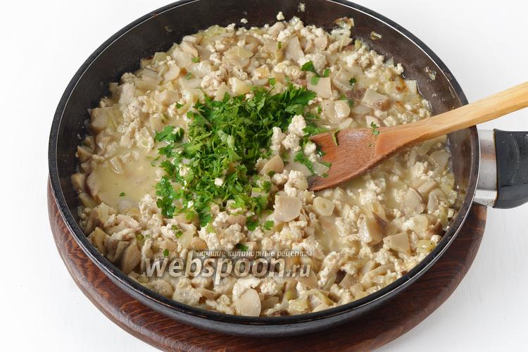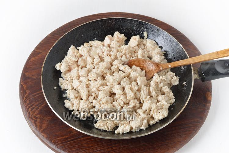 Куриный фарш (300 грамм) обжарить 6-7 минут на сковороде с 1 столовой ложкой подсолнечного масла. Приправить частью соли и чёрного молотого перца.