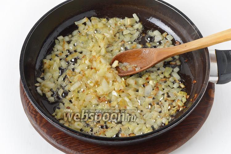 Лук очистить, 70 грамм нарезать кубиками, 1 зубчик чеснока очистить и нарезать пластинками. Обжарить овощи на остальном подсолнечном масле (2 ст. л.) до прозрачности.
