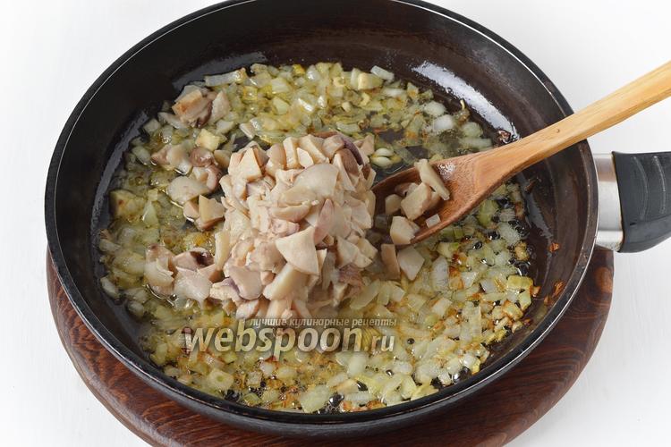 Добавить замороженные белые грибы (300 грамм). Готовить всё вместе, периодически помешивая, 6-7 минут.