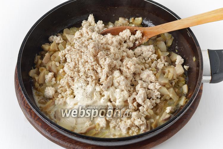 Добавить подготовленный фарш, 150 грамм сметаны, 100 мл воды. Приправить по вкусу солью и чёрным молотым перцем. Готовить на небольшом огне, иногда помешивая, 10-12 минут.