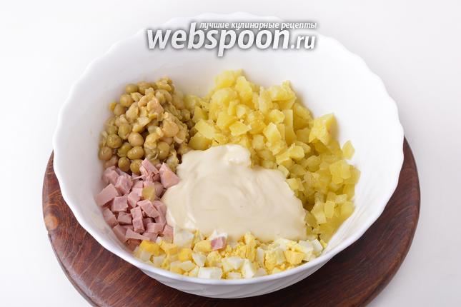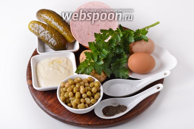 Для работы нам понадобится ветчина, яйца, солёные огурцы, консервированный горошек, картофель, майонез, соль, чёрный молотый перец, петрушка.