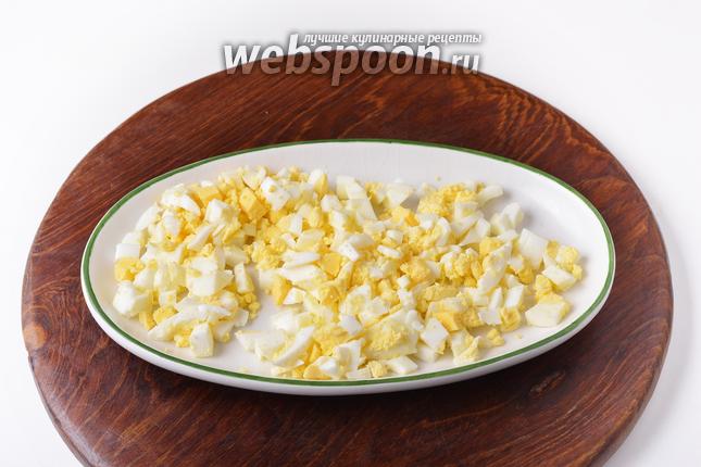 2 яйца отварить вкрутую, охладить, очистить и нарезать небольшими кубиками.