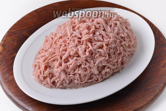 Отложить 1 кружочек ветчины для украшения, а остальную разделить на 2 части (всего у нас 300 грамм ветчины). Одну часть нарезать кубиками, а вторую натереть на крупой тёрке.