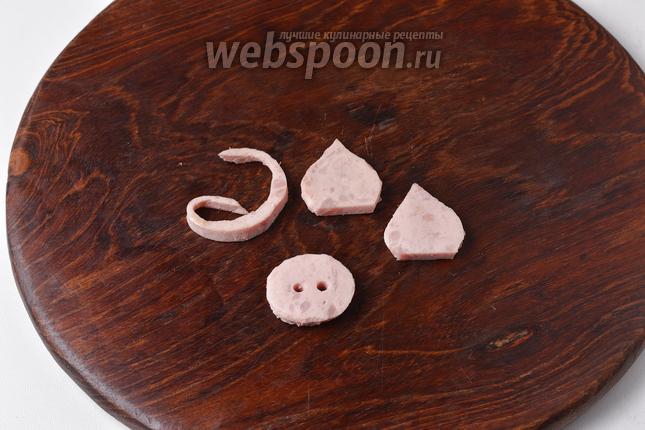 Из отложенного кружочка ветчины вырезать пятачок, ушки и хвост.