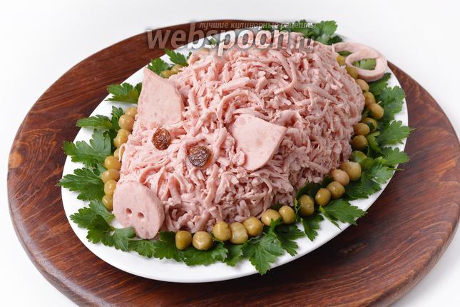 На овальном блюде сформировать из салата свинью. Сверху обсыпать ветчиной, натёртой на тёрке.