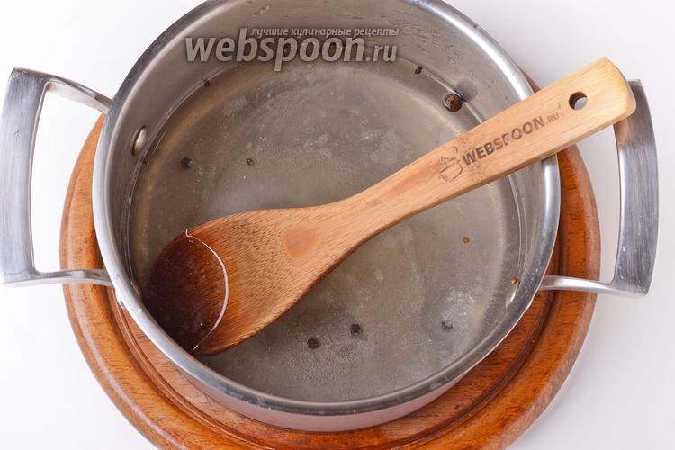 Слить воду в кастрюлю, добавить 30 грамм сахара и 20 грамм соли. Перемешать до растворения сахара и соли и довести до кипения. Проварить 1 минуту, а в конце добавить 25 мл уксуса.