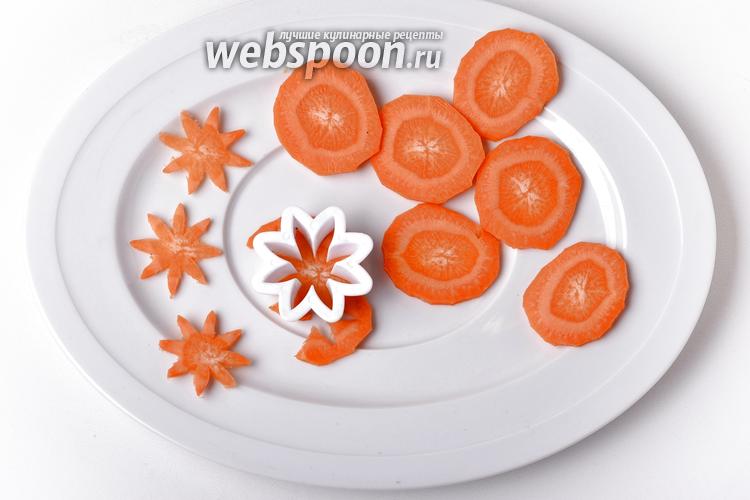 Морковь очистить, нарезать 35 грамм тонкими кружочками и вырубкой для печенья или мастики «звёздочка» вырезать фигурки. Обрезки моркови сохранить.
