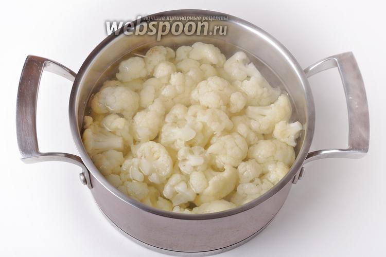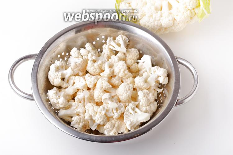 600 грамм капусты разобрать на соцветия. Большие соцветия разрезать на 2-3 части. Тщательно промыть под проточной водой.