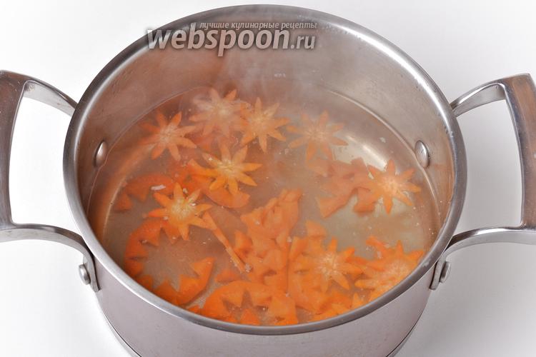 В ту же воду выложить морковь (звёздочки и обрезки). Довести воду до кипения и готовить на минимальном огне 1,5 минуты. Откинуть на дуршлаг.