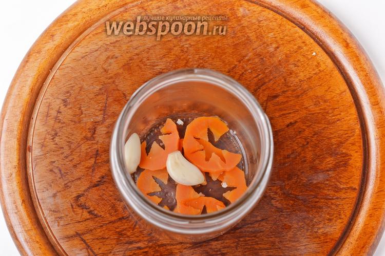 В стерилизованные банки, на дно каждой, выложить очищенный 1 зубчик чеснока, разрезанный на 2-3 части и половину обрезков моркови.