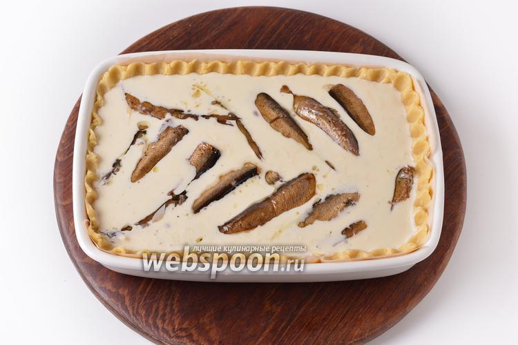Вылить тесто в форму. Сверху разложить шпроты (1 банка).
