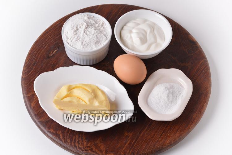 Для приготовления теста нам понадобится сливочное масло, мука, разрыхлитель, желток, сметана.