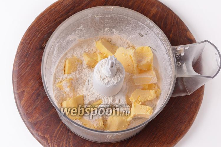 В чашу кухонного комбайна (насадка металлический нож) просеять 200 грамм муки с разрыхлителем (1 ч. л.) и солью (0,5 ч. л.). Сверху нарезать кусочками 100 грамм холодного сливочного масла.