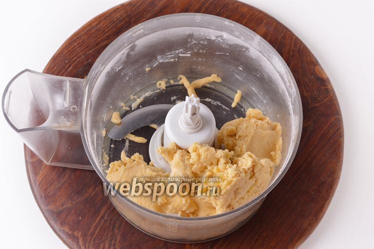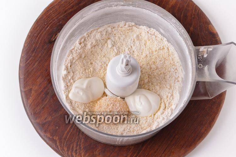 Включить комбайн на 20-30 секунд для того, чтобы образовалась крошка. Добавить 1 желток и 2 столовых ложки сметаны.