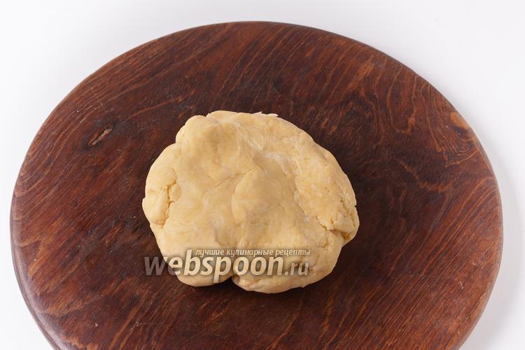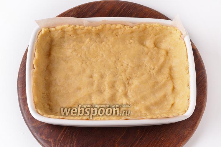 Форму размером 17х22 сантиметра застелить пергаментом. Натереть тесто на крупной тёрке в форму, вилкой равномерно распределить по всей форме и сформировать высокие бортики и дно, прижимая тесто к форме. Отправить в холодильник на 30 минут.