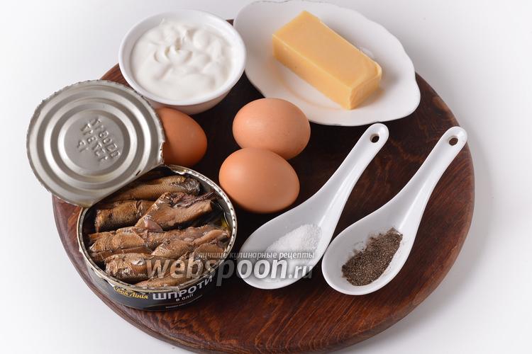 Для приготовления начинки нам понадобятся шпроты, яйца, твёрдый сыр, сметана, соль, чёрный молотый перец.