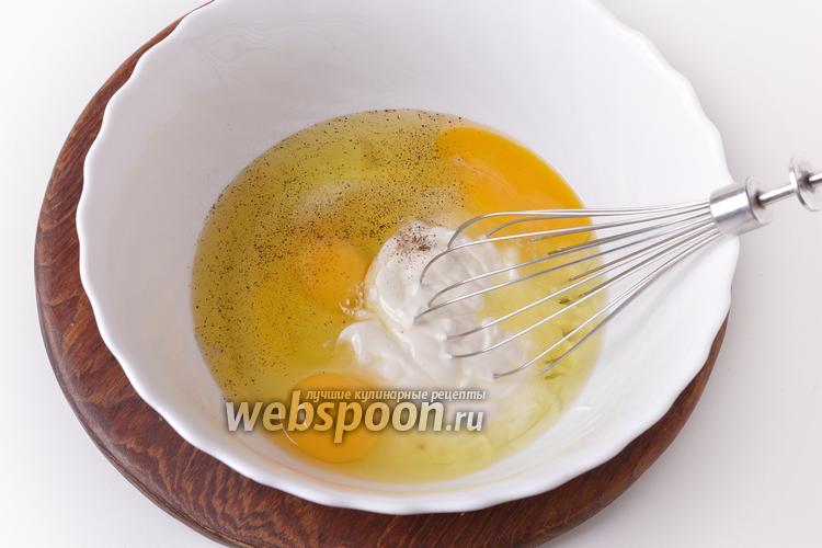Соединить 3 яйца, 1 белок (остался от приготовления теста), 250 грамм сметаны, соль (0,5 ч. л.), чёрный молотый перец (0,1 ч. л.). Перемешать венчиком.