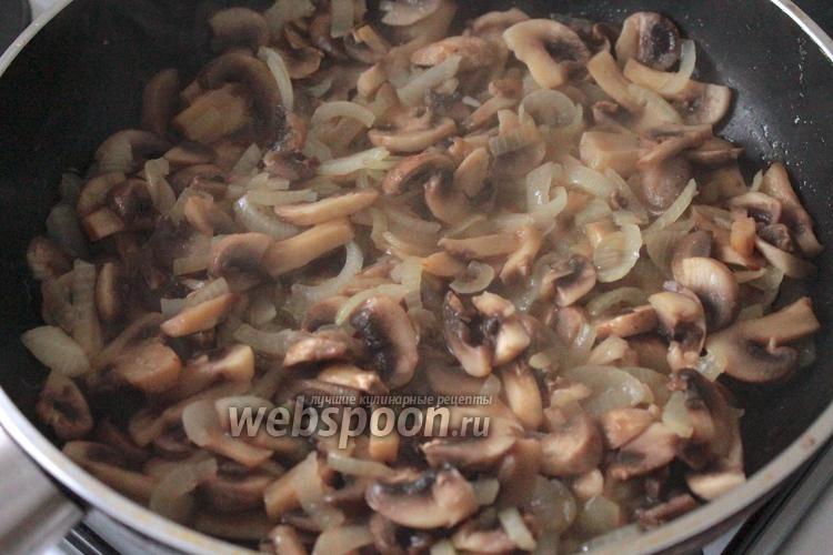 Шампиньоны вымыть и нарезать пластинками, положить к поджаренному луку, посолить. Перемешать и жарить до зарумянивания.