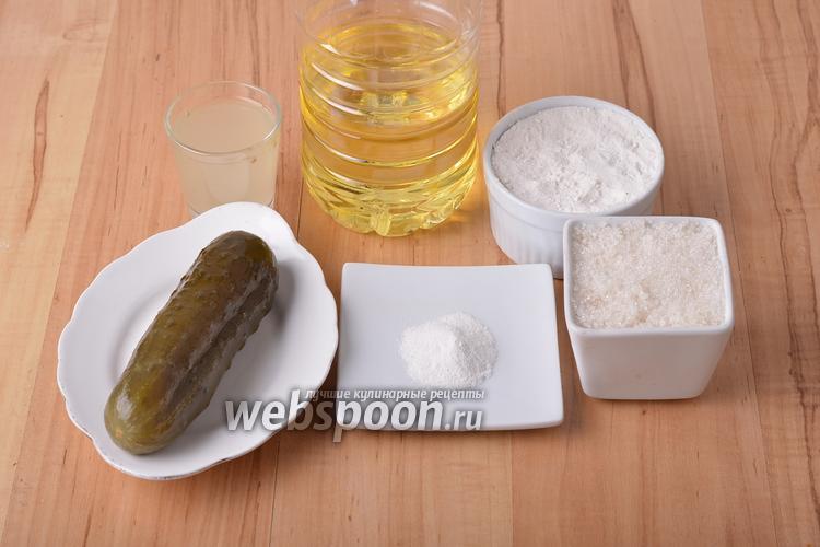 Для работы нам понадобятся соленые огурцы, огуречный рассол, подсолнечное масло, сахар, мука, разрыхлитель.