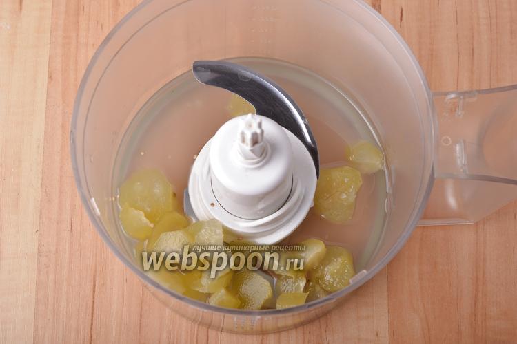 В чашу кухонного комбайна (насадка металлический нож) выложить 60 грамм очищенных от кожицы огурцов (вес уже очищенных огурцов) и 90 мл огуречного рассола.