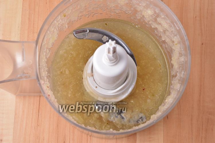 Измельчить до состояния кашицы. Добавить 80 мл подсолнечного масла и 50 грамм сахара. Включить комбайн ещё на 1 минуту.