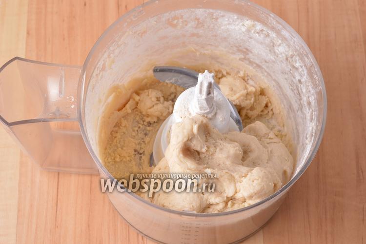 Добавить 300 грамм просеянной муки и 1,5 чайной ложки разрыхлителя. Включить комбайн на 1 минуту. Как только тесто соберётся в ком, оно готово.