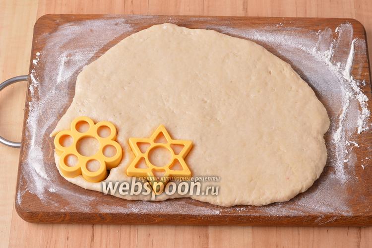 Вынуть тесто и раскатать его, на слегка подпылённой мукой доске (используйте дополнительно 1 ст. л. муки для подпыла), в пласт толщиной примерно 1 сантиметр. С помощью формочек вырезать из теста фигурки.