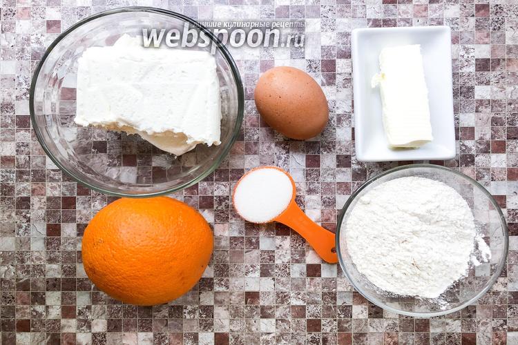 Для вареников возьмите творог, яйца, муку, сахар, апельсин, сливочное масло.