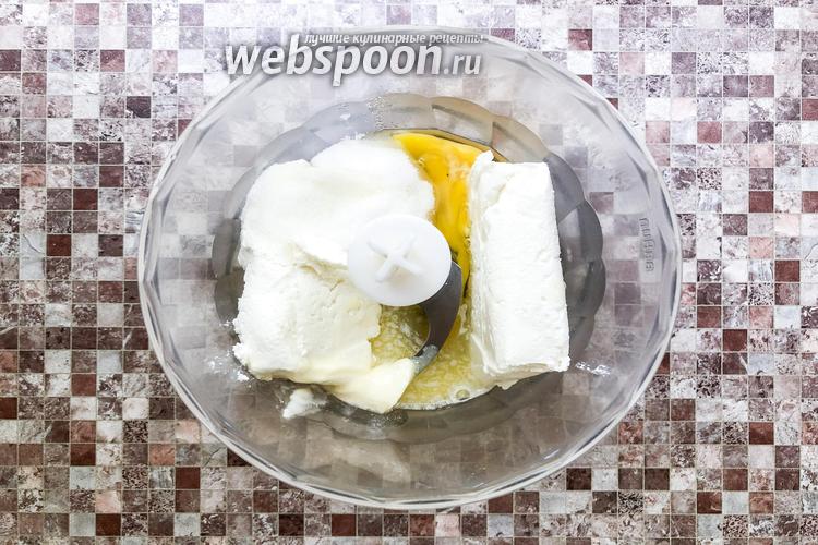 Смешайте вместе 500 грамм творога, 2 яйца, растопленное сливочное масло (60 г) и сахар (2 ст. л.).