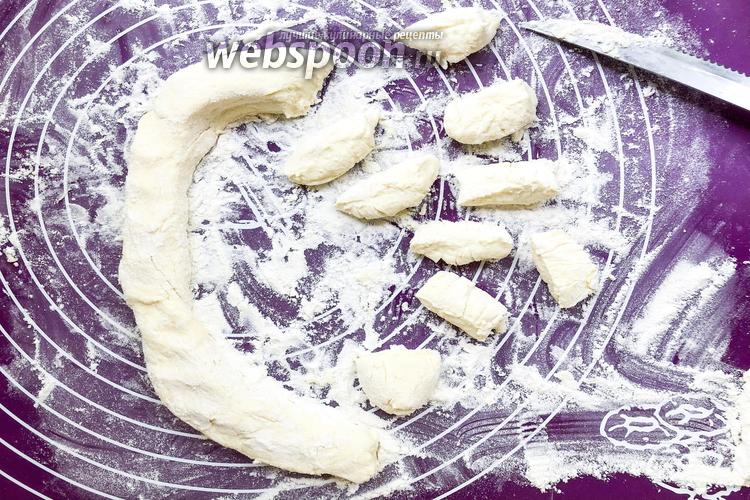 Припылите поверхность мукой (10 г). Скатайте творожную массу в колбаску и нарежьте на небольшие кусочки.