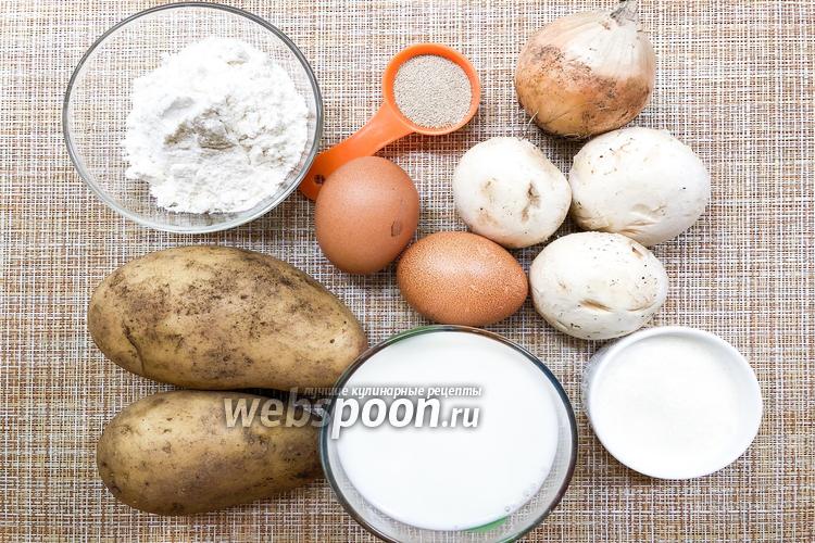 Для приготовления возьмите муку пшеничную, молоко, дрожжи, яйца, шампиньоны, лук, сливки, соль, картофель и подсолнечное масло.