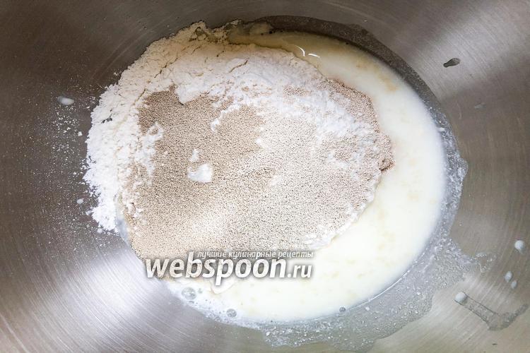 Подогрейте молоко (200 мл). Смешайте его с мукой (300 г) и дрожжами (15 г). Вымесите однородное тесто. Накройте полотенцем и поставьте в тёплое место на 30 минут.