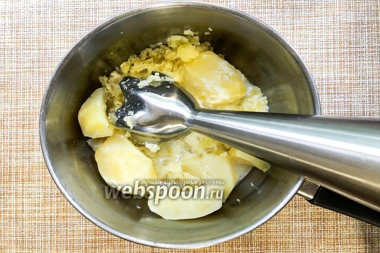 Отварите 4 картошины до готовности. Слейте воду, добавьте соль (0,5 ч. л.) и сливки (50 мл). Измельчите погружным блендером в однородную массу без комочков.