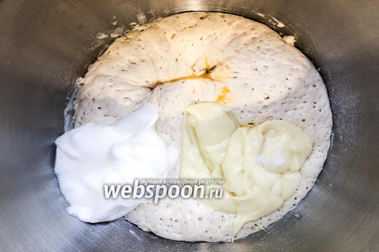 В поднявшуюся опару добавьте пюре, соль (1 ч. л.), 2 куриных желтка и 2 куриных белка (взбитых в густую пену). Аккуратно перемешайте всё до однородной массы.