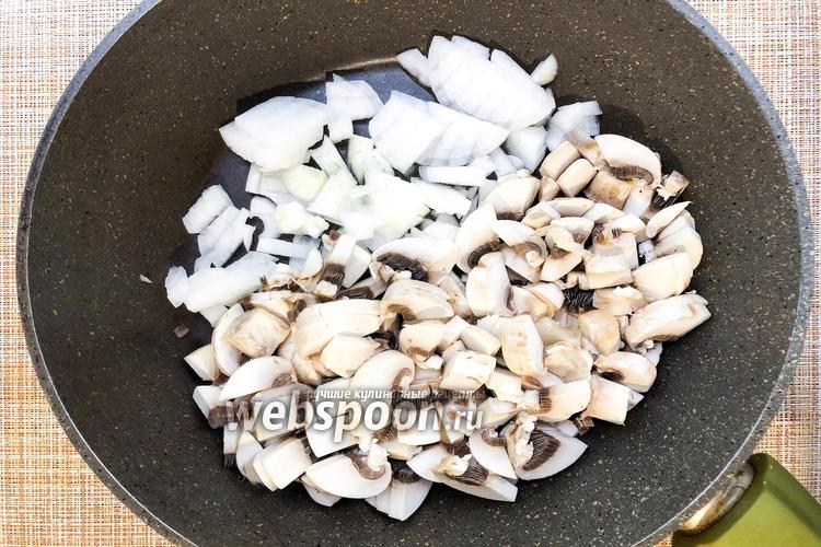Мелко нарежьте 1 репчатый лук и шампиньоны (100 г). Обжарьте на подсолнечном масле (1 ст. л.) до мягкости лука. Добавьте соль (0,5 ч. л.).