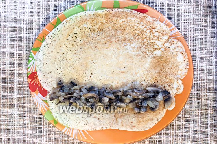 На готовый блин выложите грибную начинку (2 ст. л.) и заверните в рулет.