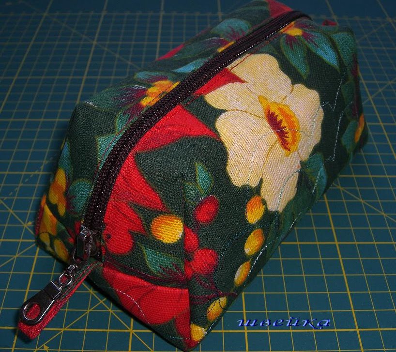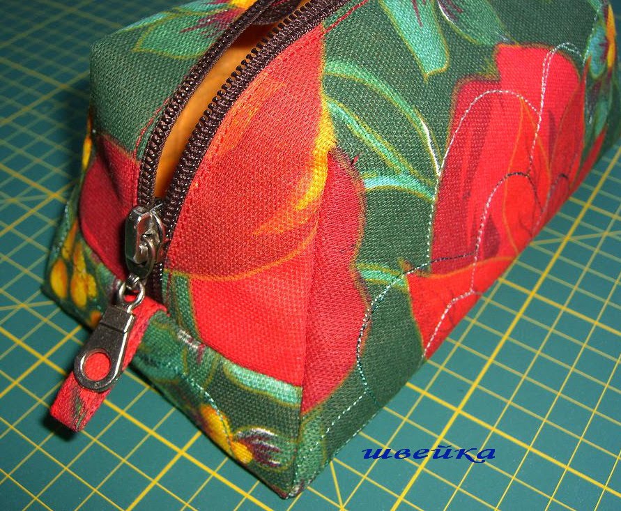[показать] Складываем косметичку, как на фото, и прошиваем боковые части.