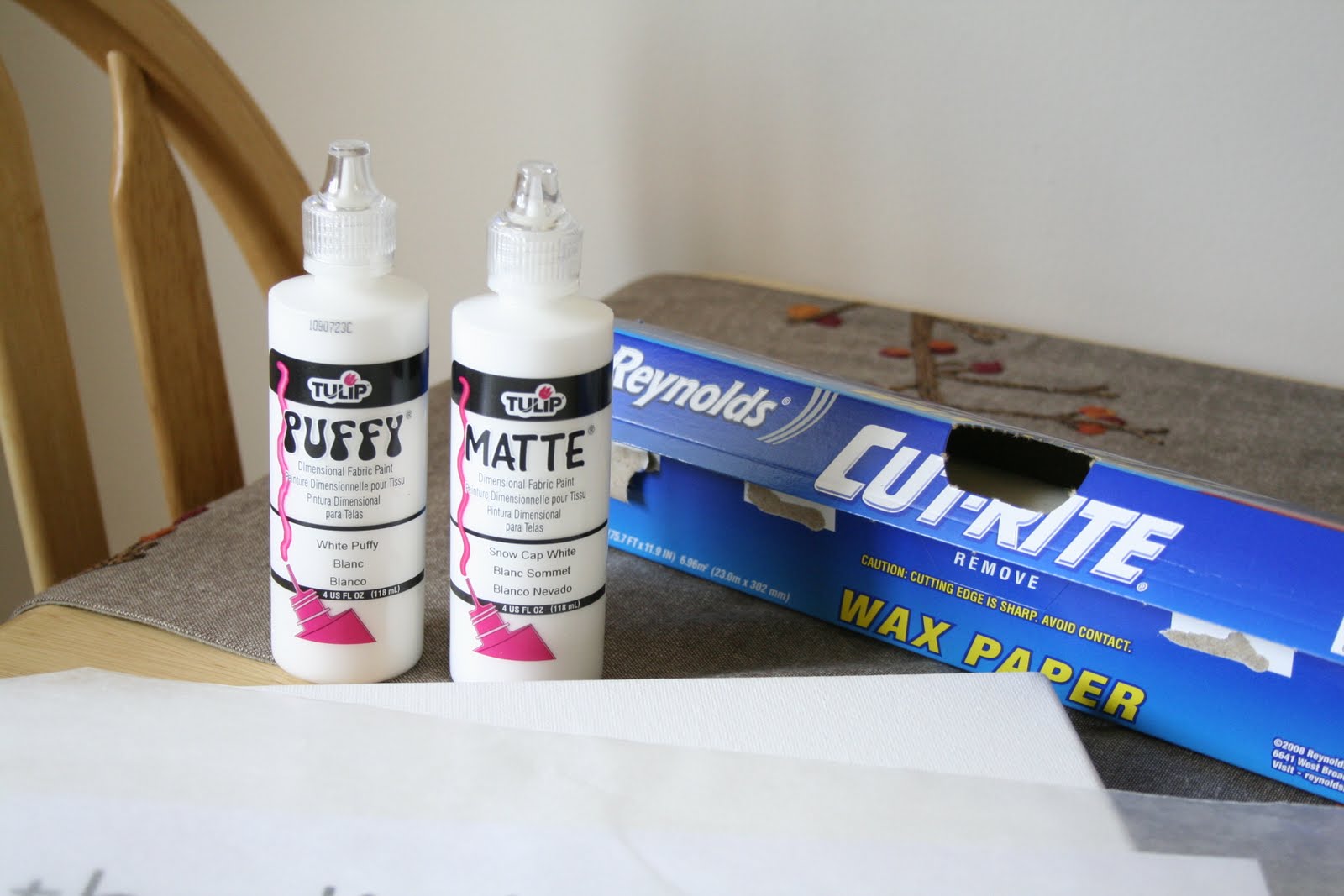 Далее вощеная клеенка закрепляется на столе скотчем и начинаем писать специальными объемными красками (ниже есть фото) или можно попробовать белый герметик, жидкие гвозди.